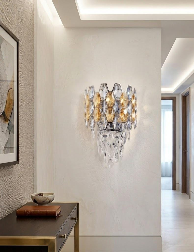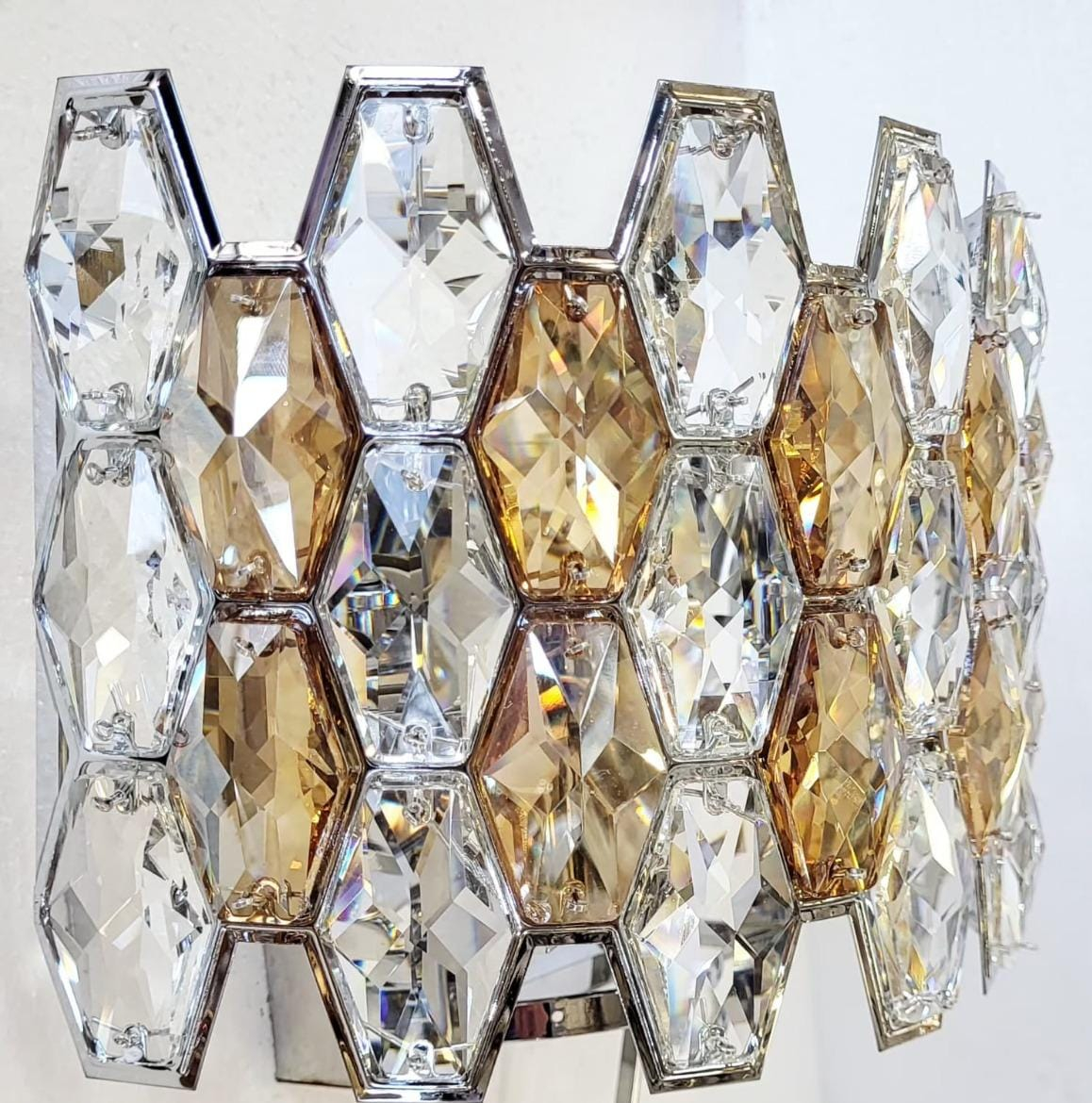 Designul geometric tip fagure oferă un aspect modern și sofisticat, în timp ce combinația de cristale amber și transparente creează o lumină caldă, plăcută și relaxantă.