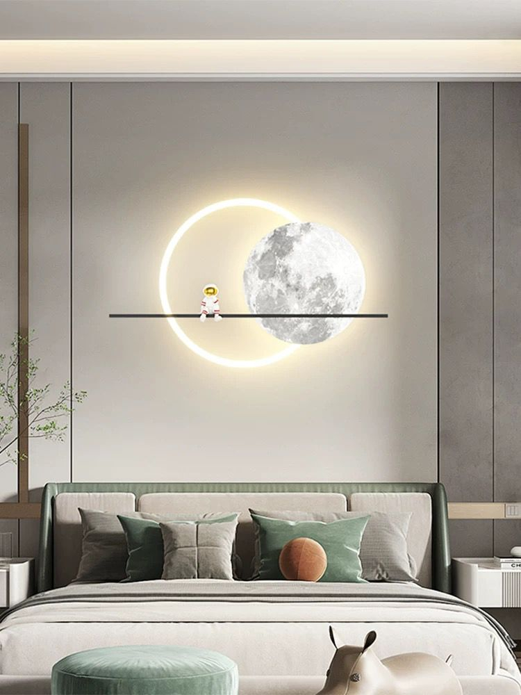 Transformă camera copilului sau orice spațiu într-un univers magic cu aplica și ornamentul de perete model 2557. Această piesă de design combină funcționalitatea iluminării LED moderne cu un decor inspirat din cosmos, având un cerc luminos de 50 cm, o lună decorativă de 37 cm și o tijă de 85 cm pe care se află un astronaut miniatural.