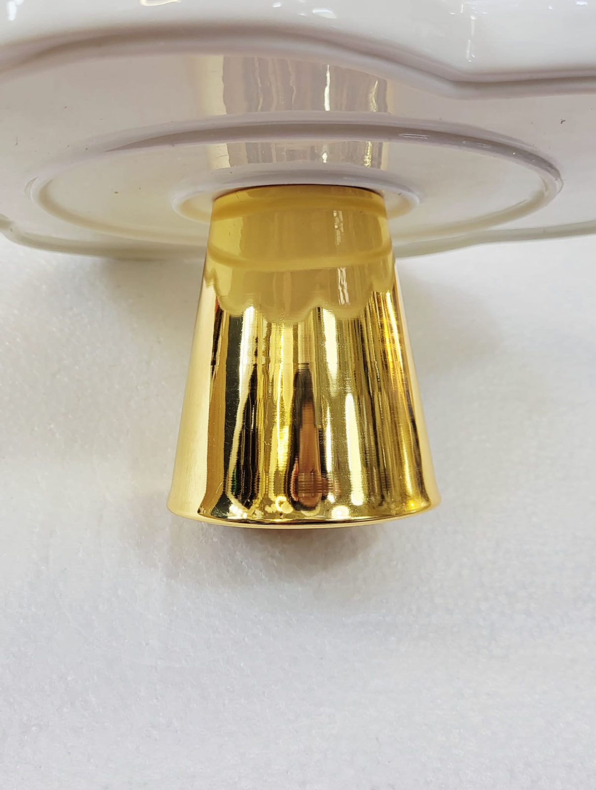 Ceramica albă oferă un aspect curat și luminos, în timp ce piciorul metalic vopsit în auriu adaugă o notă de lux și eleganță, transformând orice masă într-o prezentare festivă. Modelul are dimensiuni perfecte pentru prăjituri mici, brioșe, tarte sau aranjamente tematice.