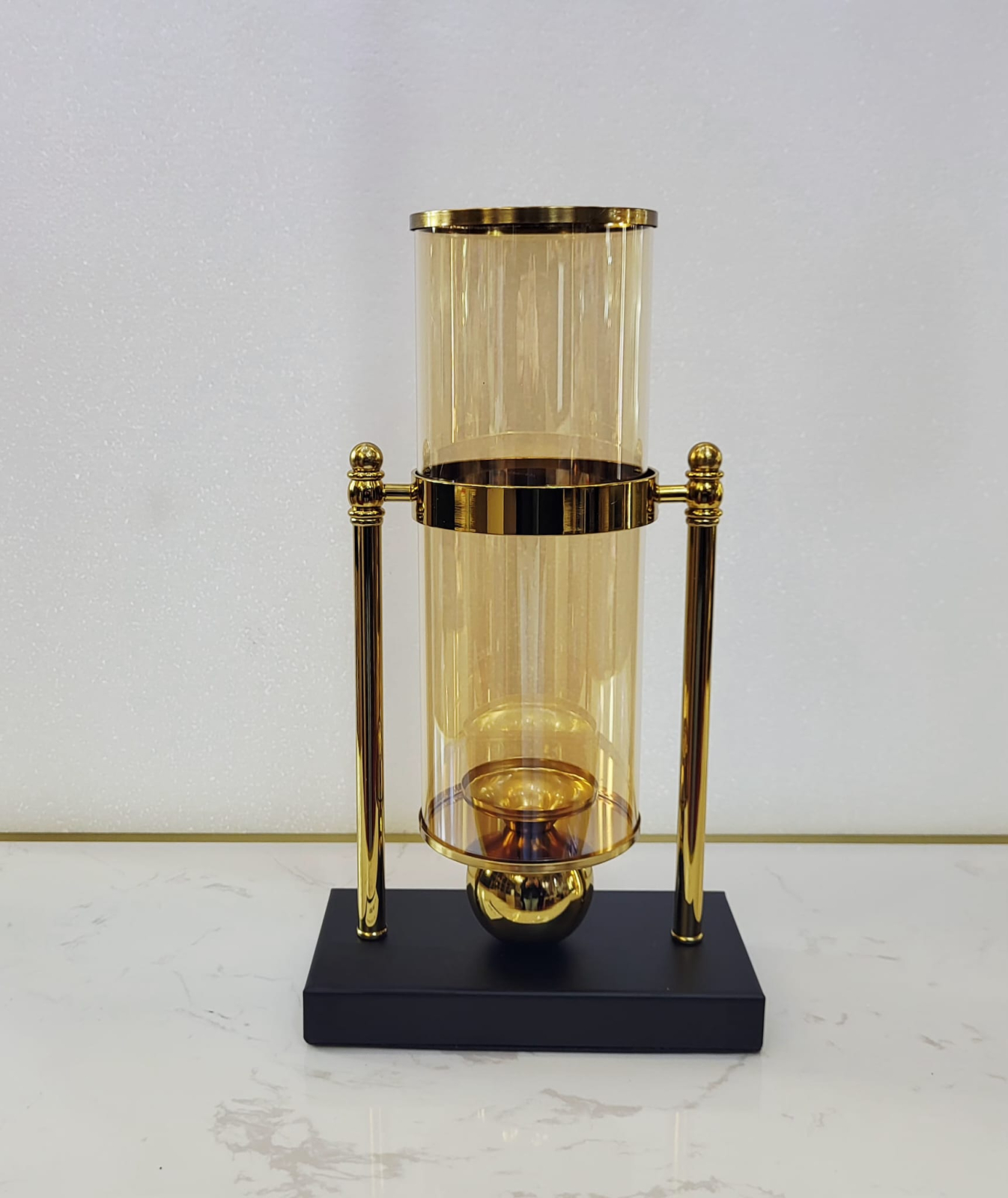 Cilindrul de sticlă, cu nuanțe calde de auriu, este susținut de un suport metalic auriu format din două tije verticale, montate pe o bază neagră stabilă. Această structură creează un contrast rafinat și permite integrarea decorului în numeroase stiluri: contemporan, minimalist, industrial sau glamour.