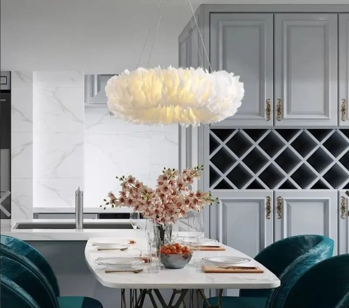 Lustra 1098 este un corp de iluminat decorativ cu un design aerat și modern, creat pentru a aduce o stare de confort și relaxare în spațiile interioare. Realizată din pene naturale de gâscă, montate pe un cadru circular, lustra are un aspect pufos, asemănător unui nor, devenind un element vizual plăcut și discret.