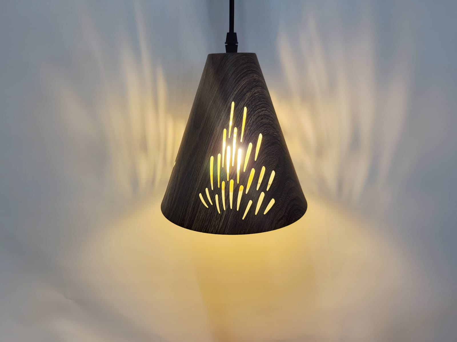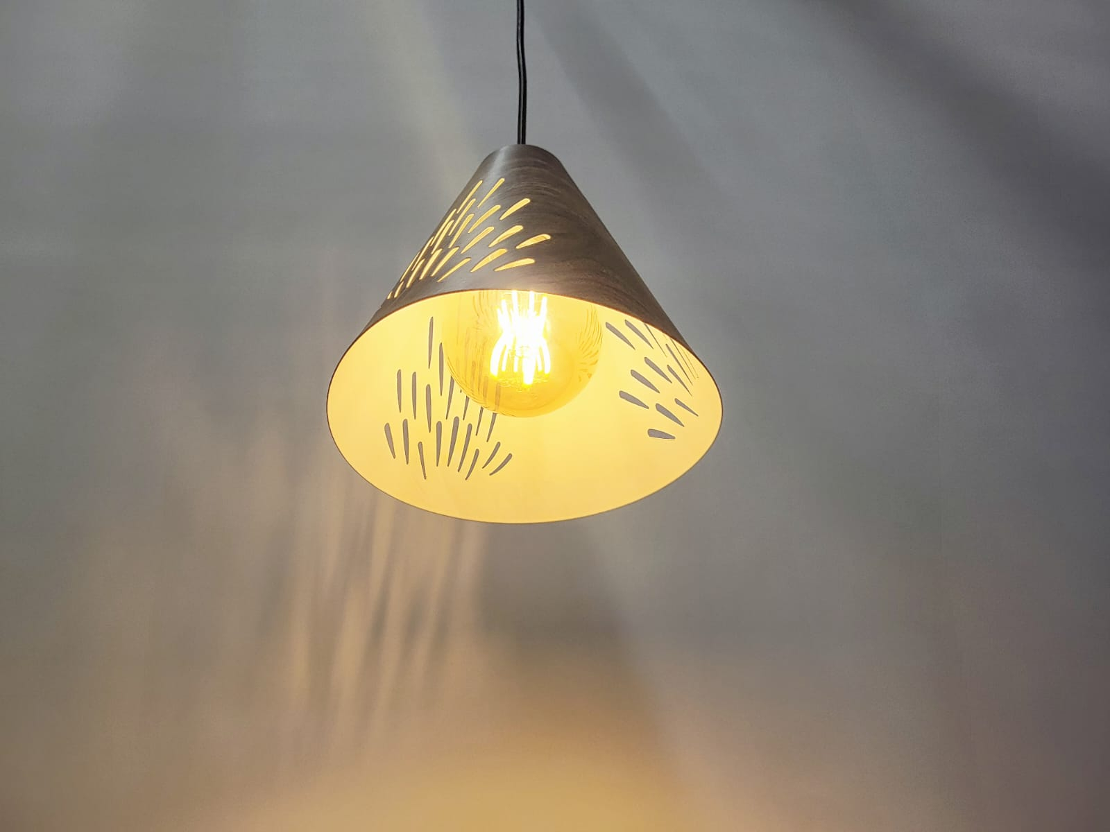 Cele 3 pendule suspendate au cabluri reglabile de până la 90 cm, permițându-ți să creezi o compoziție unitară sau un joc vizual prin diferențe de înălțime. Lumina filtrată prin perforațiile abajurului creează un ambient plăcut și relaxant, ideal pentru serile petrecute acasă.
