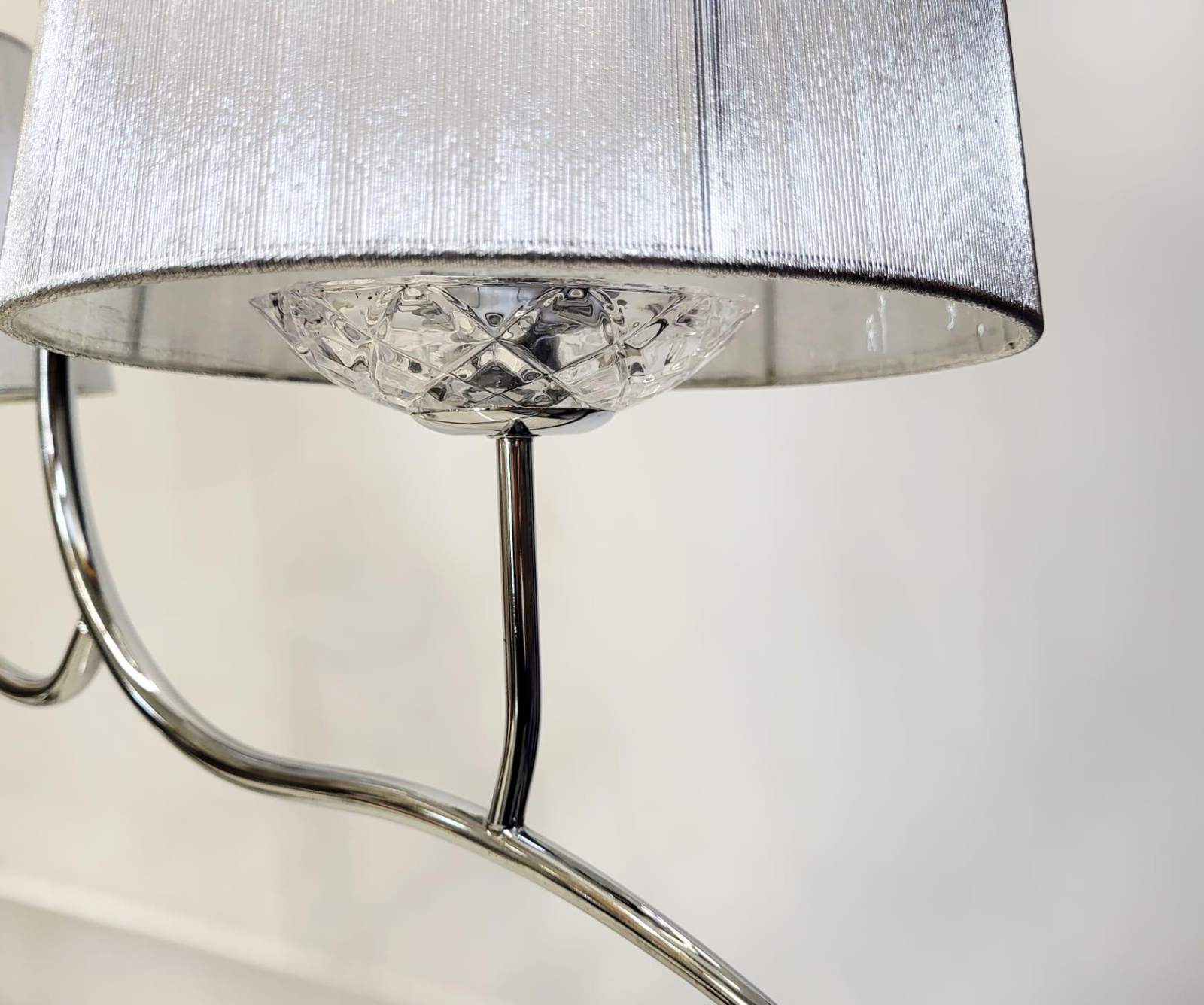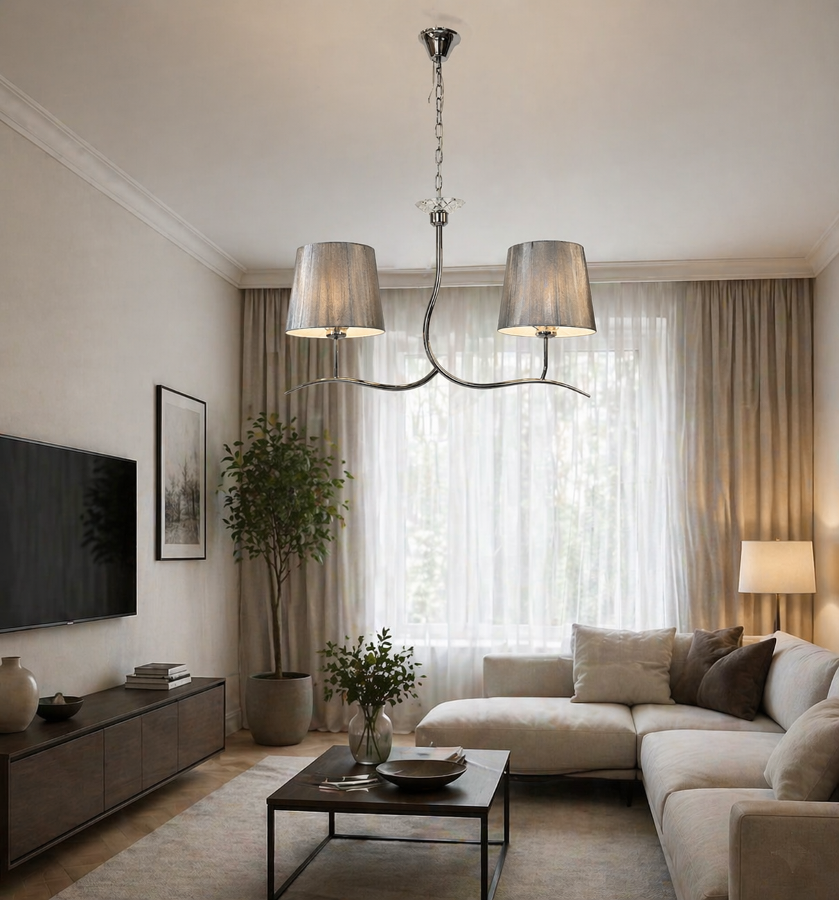 Structura din metal crom lucios oferă rezistență și un aspect contemporan, iar cele două abajururi textile gri asigură o lumină plăcută, fără disconfort vizual. Lumina este filtrată uniform, creând un ambient relaxant, ideal pentru utilizarea zilnică.