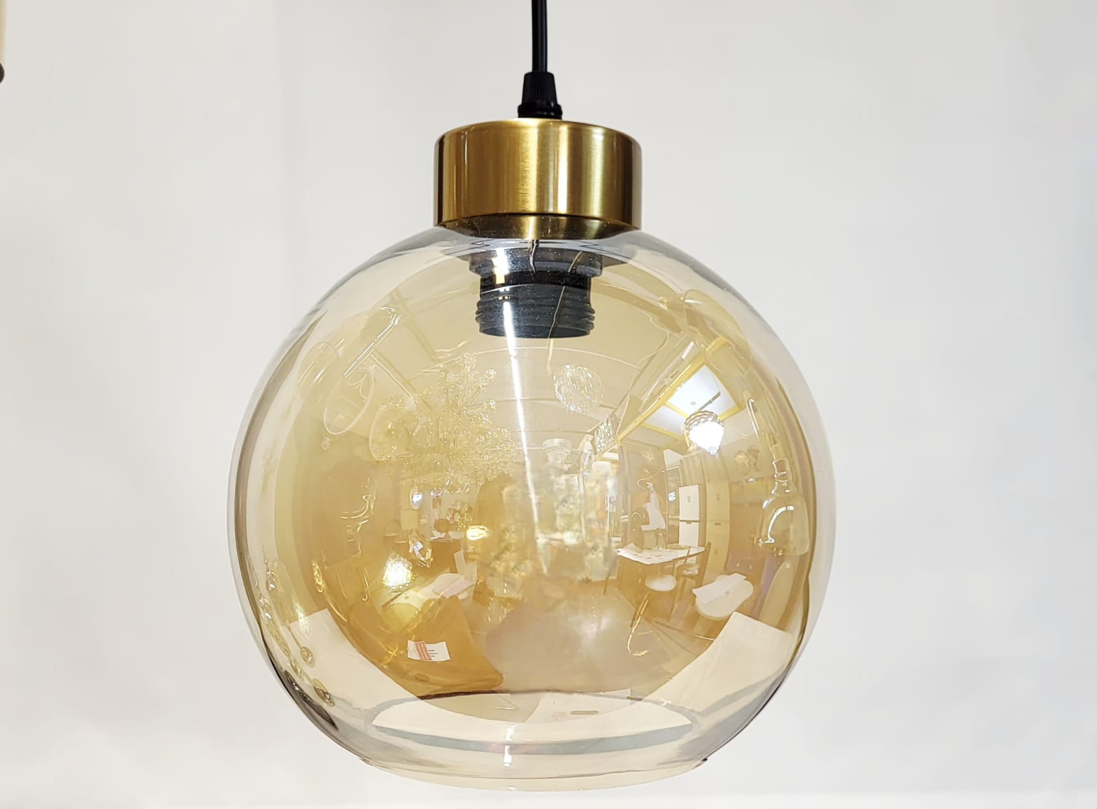 Structura metalică neagră, cu linii curate și finisaj mat, susține abajururile într-o dispunere aerisită, evidențiind contrastul dintre metalul sobru și reflexiile calde ale sticlei. Suportul de tavan cu lungimea de 100 cm conferă stabilitate și permite integrarea armonioasă deasupra unei mese de dining, într-un living sofisticat sau într-un hol cu design bine definit.