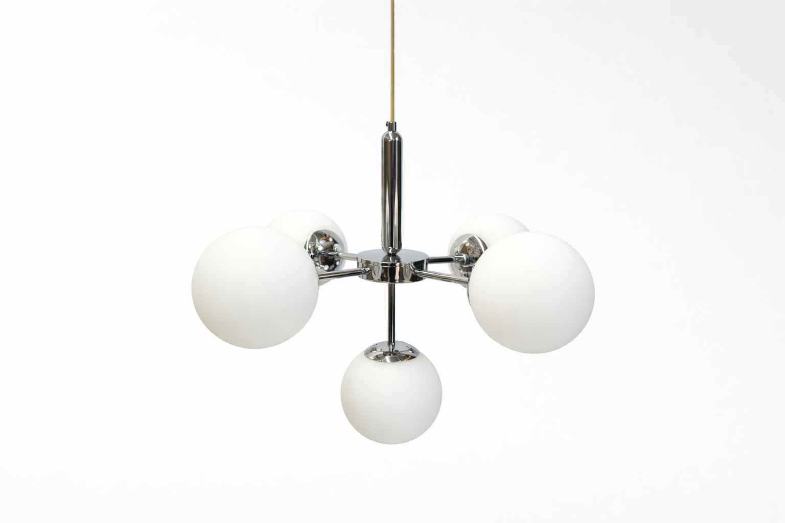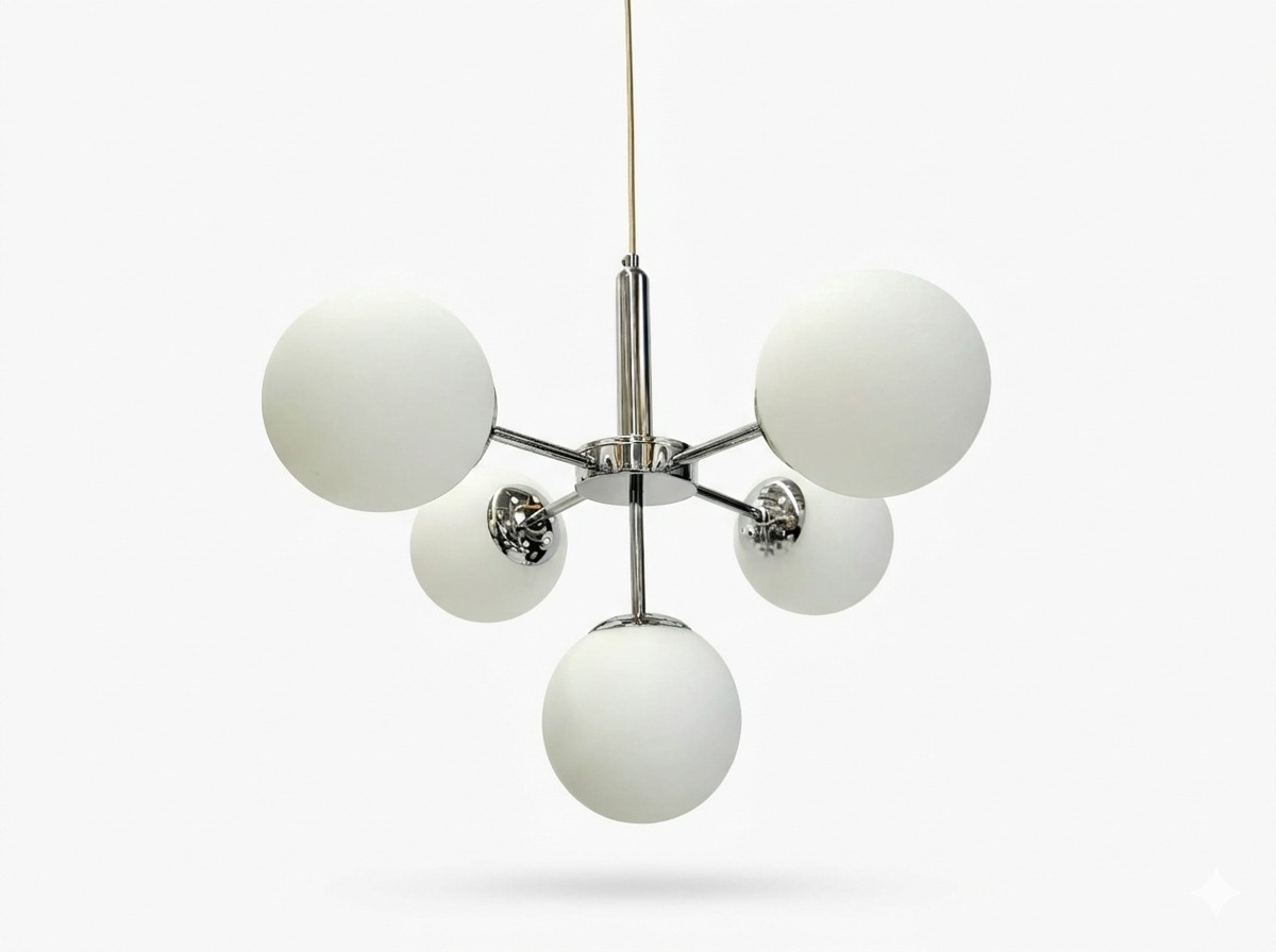Lustra 1717/5 CH este realizată din metal argintiu și are cinci globuri din sticlă albă, fiecare cu un diametru de 15 cm. Funcționează cu cinci becuri E27 (nu sunt incluse) și o tensiune de 220V. Potrivită pentru diverse spații, cum ar fi bucătăria, sufrageria sau locuri comerciale, această lustră adaugă un accent elegant și modern.