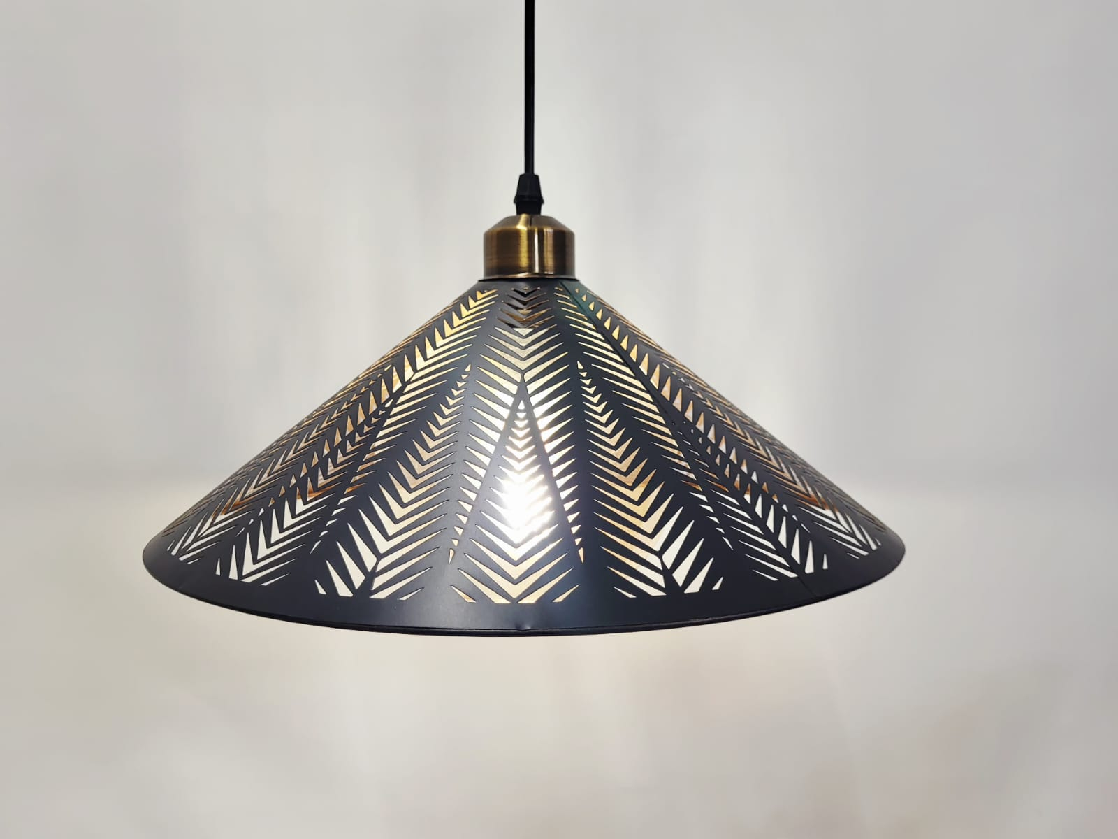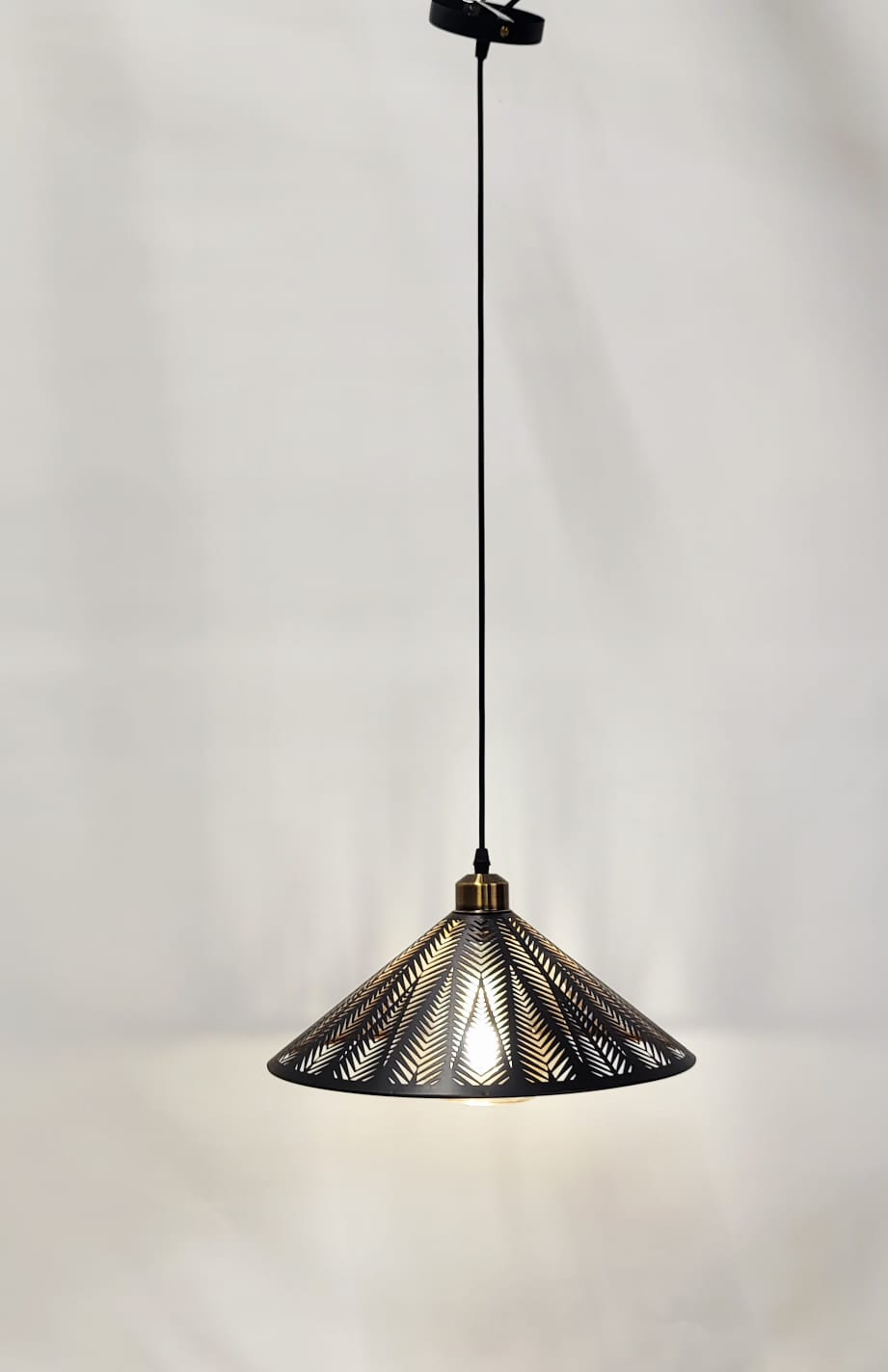 Pendulul 9110/1 BK impresionează prin designul său minimalist, dar în același timp sofisticat. Realizat din metal de calitate, are un finisaj negru la exterior și un interior auriu, ce oferă un joc elegant de lumini și umbre datorită perforațiilor decorative în formă geometrică.