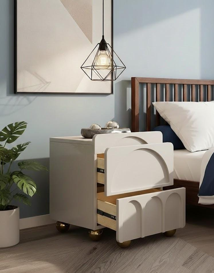 Noptiera modernă MGG 483552 este o piesă statement, creată pentru interioare elegante și bine echilibrate. Realizată din MDF cu finisaj alb mat, aceasta se remarcă prin fronturile cu arcade decorative și picioarele sferice aurii, care adaugă un contrast sofisticat și un aer contemporan.
