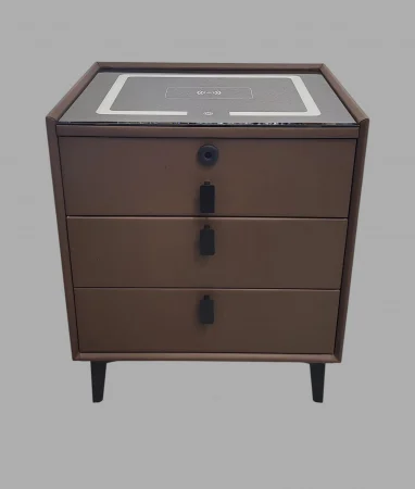 Noptiera multi inteligentă 103 Maro combină designul modern cu funcționalitatea avansată. Realizată din lemn masiv și piele ecologică, are un blat din sticlă securizată. Dispune de lumină LED în trei culori, încărcător wireless, priză USB rapidă, audio Bluetooth și blocare cu amprentă digitală. Dimensiuni: 50x40x60 cm.