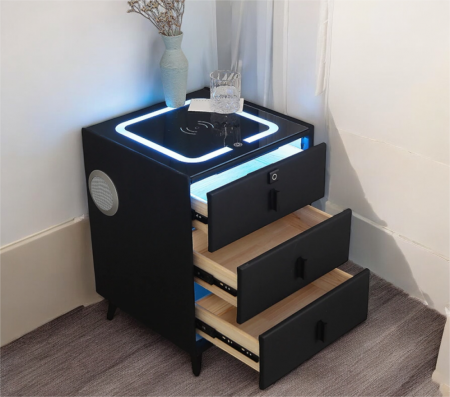 Noptiera multi inteligentă 103 Negru combină designul modern cu funcționalitatea avansată. Realizată din lemn masiv și piele ecologică, are un blat din sticlă securizată. Dispune de lumină LED în trei culori, încărcător wireless, priză USB rapidă, audio Bluetooth și blocare cu amprentă digitală. Dimensiuni: 50x40x60 cm.