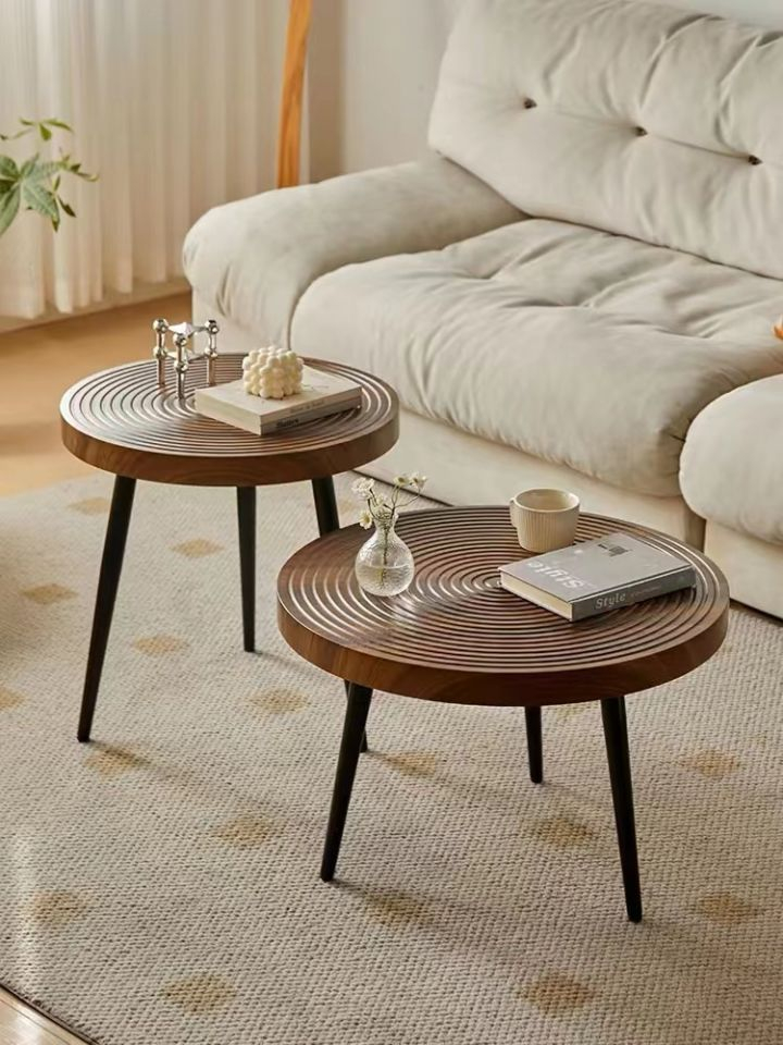 Două măsuțe rotunde, de dimensiuni diferite, cu design coordonat.