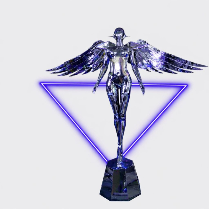 Statueta este realizată din rășină de calitate superioară, cu suprafață reflectorizantă, ce amplifică lumina și creează efecte vizuale spectaculoase în spațiile largi. Aripile metalice accentuează verticalitatea și conferă piesei un caracter arhitectural, transformând lampadarul într-un element de design dominant.