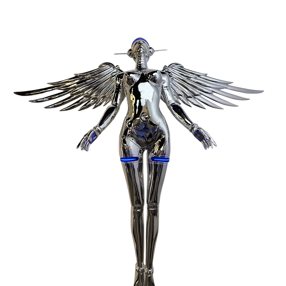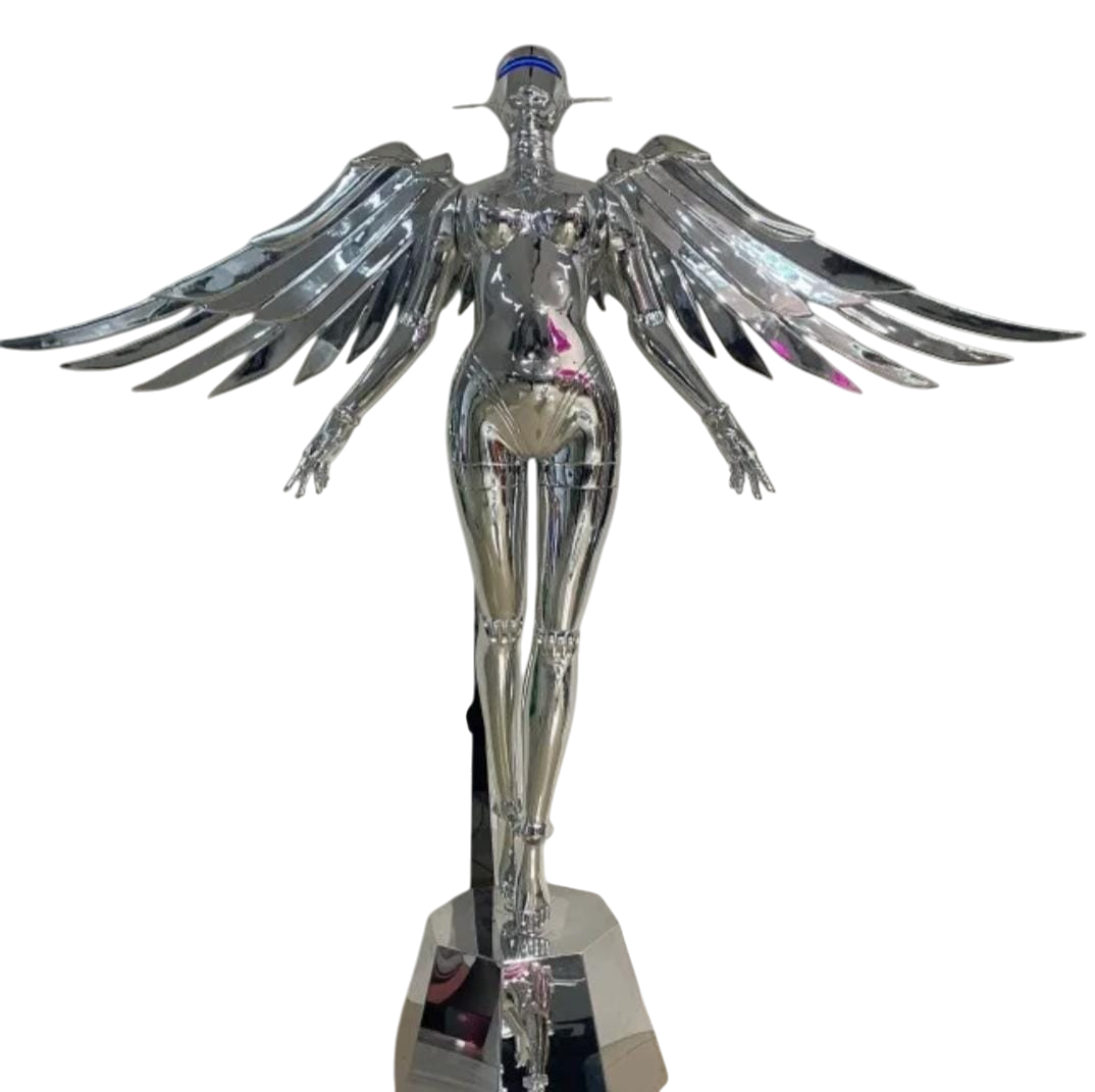 Lampadarul K 8801 este o piesă decorativă de mari dimensiuni, concepută pentru interioare contemporane care valorifică obiectele statement și designul conceptual. Forma sa impunătoare redă o siluetă de înger reinterpretată într-un limbaj vizual futurist, cu finisaj cromat tip oglindă și aripi metalice ample, atent detaliate.